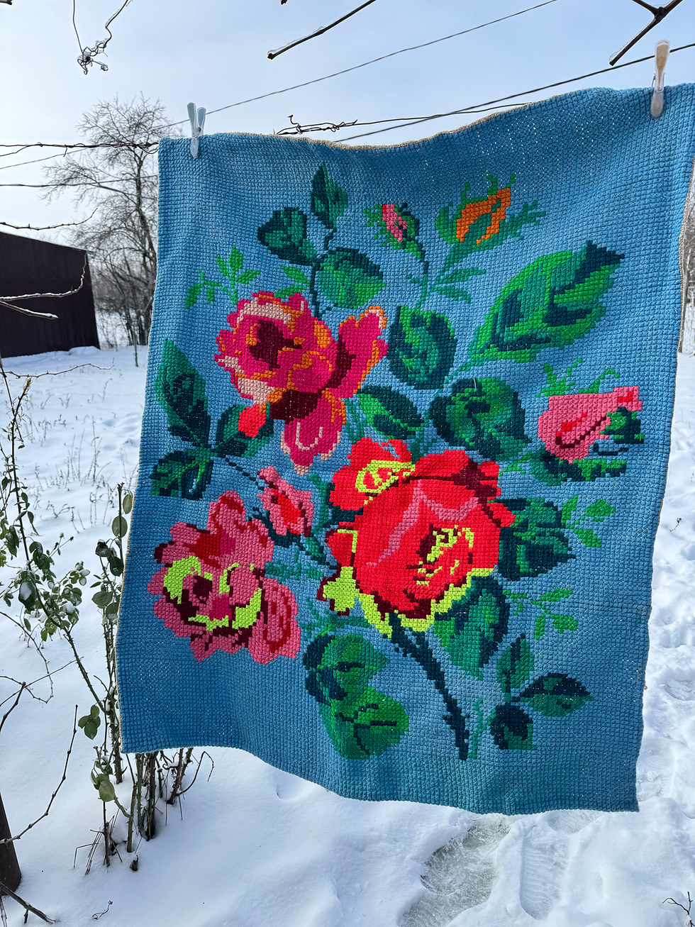 Alfombra antigua en buen estado. Hecho de dos partes cosidas en el medio.